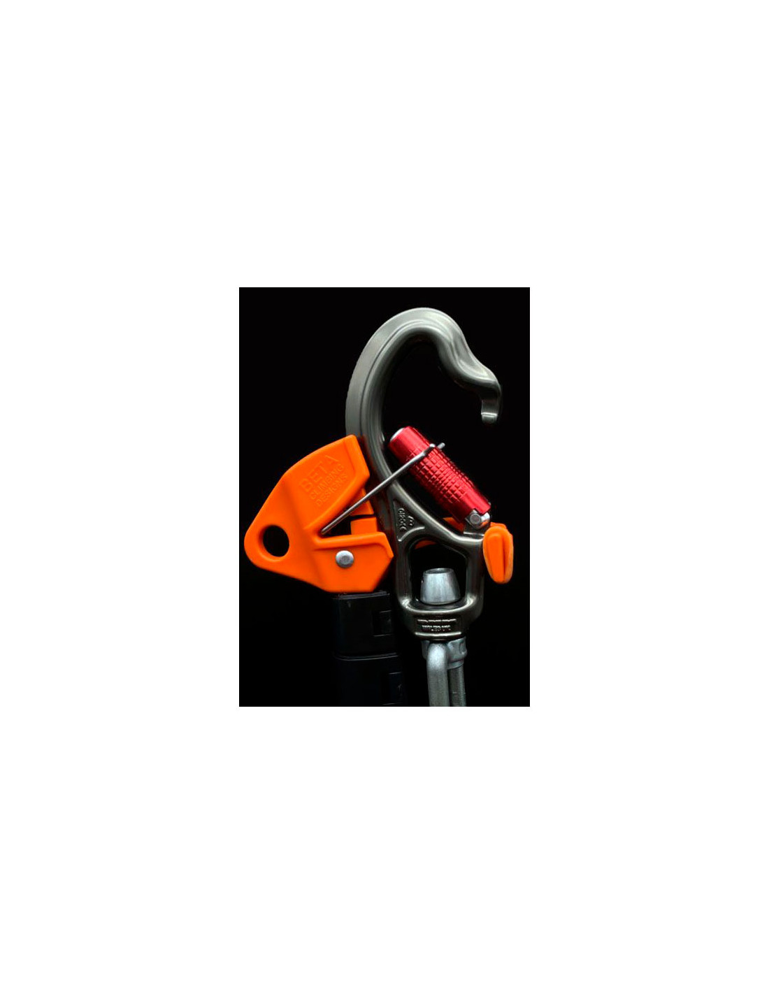 - Den har en gummispids for enden til at holde karabinhagen i den rigtige position.