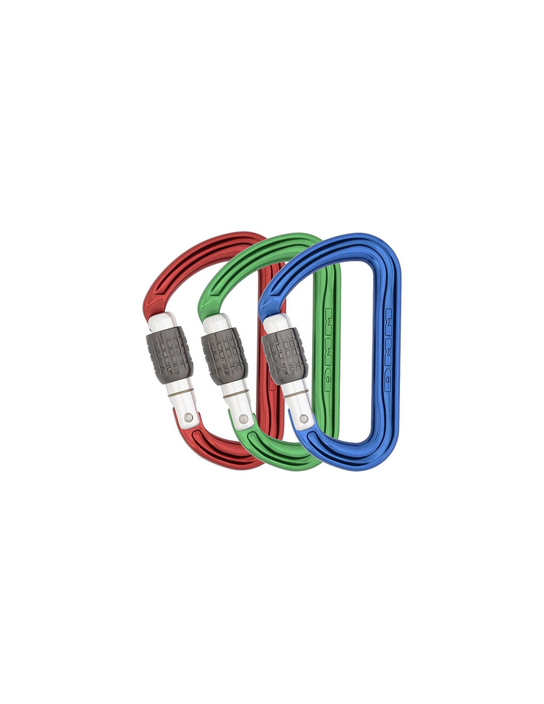 3 asimetriškų prekės ženklo DMM karabinų pakuotė su saugiu uždoriu.