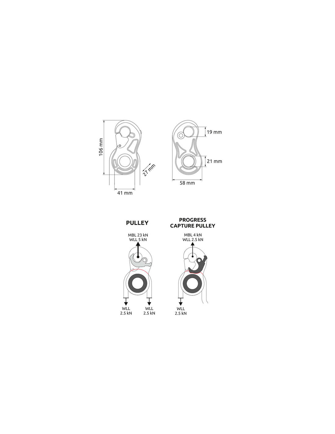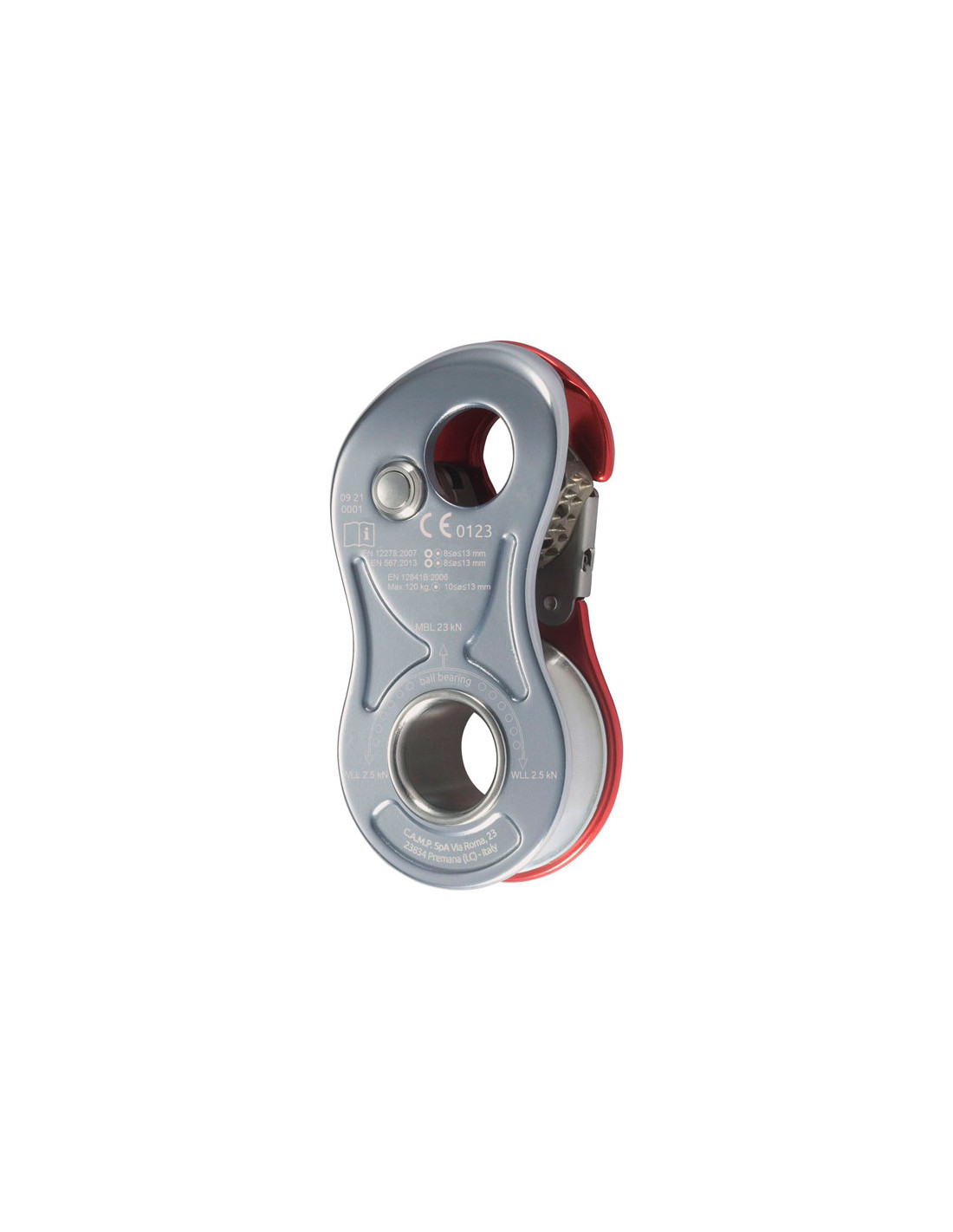 Den nedre anslutningspunkten, liksom den huvudsakliga, är mycket bred och tillåter fullständig rotation av karbinhakarna inuti. Den stora diametern på remskivan och kullagret ger utmärkt rotationseffektivitet (95 % effektivitet).